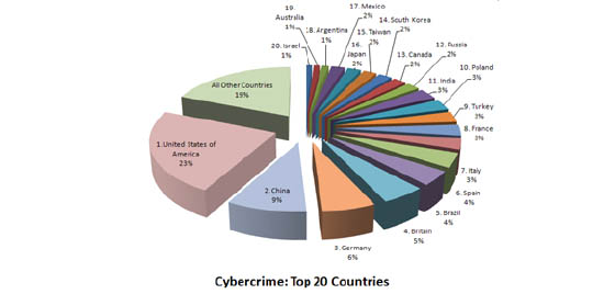 Below is an image showing the top 20 countries with appropriate cybercrime percentage levels.